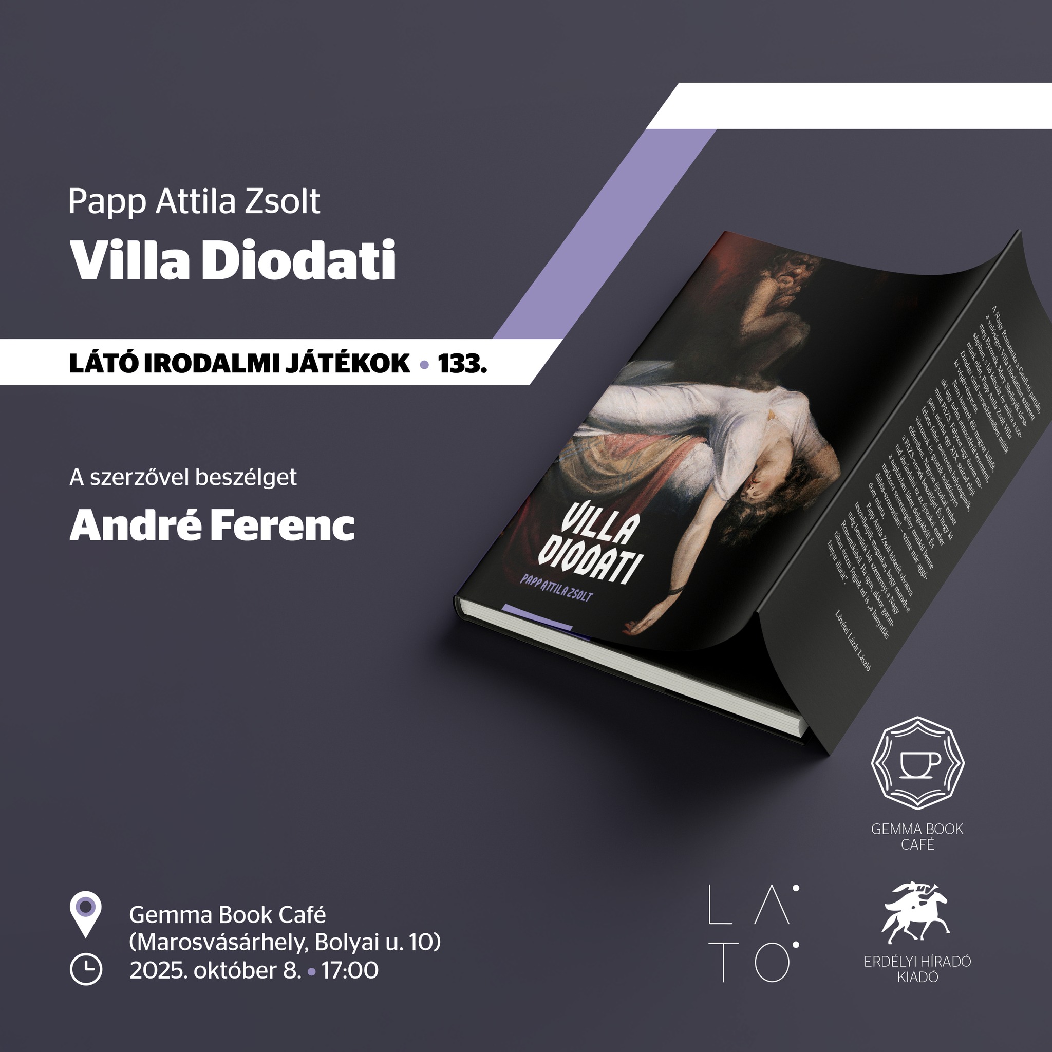 A Látó Irodalmi Játékok 133. estjén Papp Attila Zsolt legújabb, Villa Diodati című verseskötetét (Erdélyi Híradó Kiadó, 2025) mutatjuk be szerdán, október 8-án a Gemmában. A szerzővel André Ferenc beszélget.